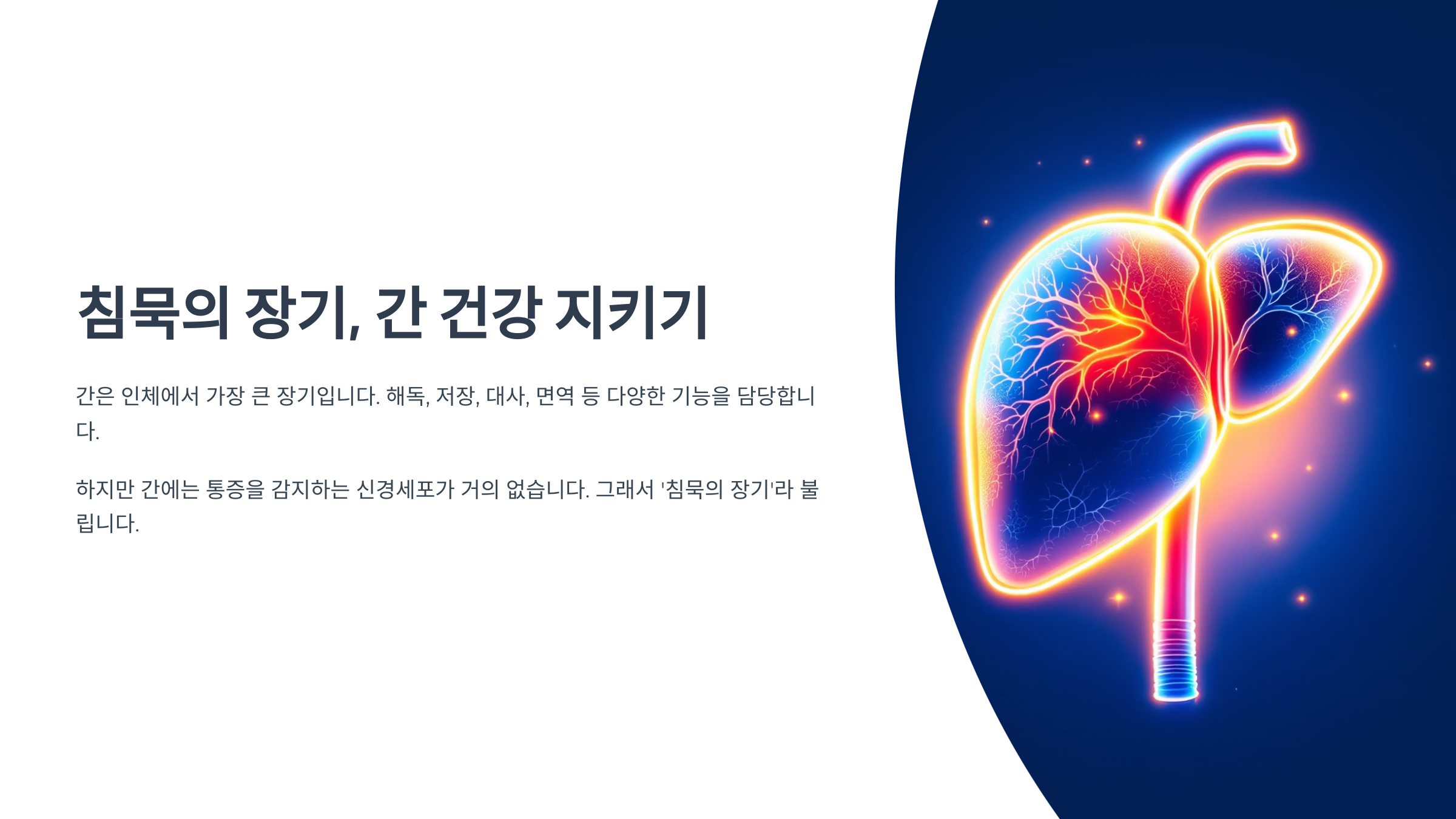 간 건강은 눈에 보이지 않지만, 매일의 선택이 미래의 간을 만듭니다. 무심코 넘기는 피로감, 소화불량, 오른쪽 복부의 불쾌감이 바로 간의 경고일 수 있습니다. 지금부터라도 식습관과 생활습관을 점검해, 소리 없는 위협으로부터 내 몸을 지켜보세요.