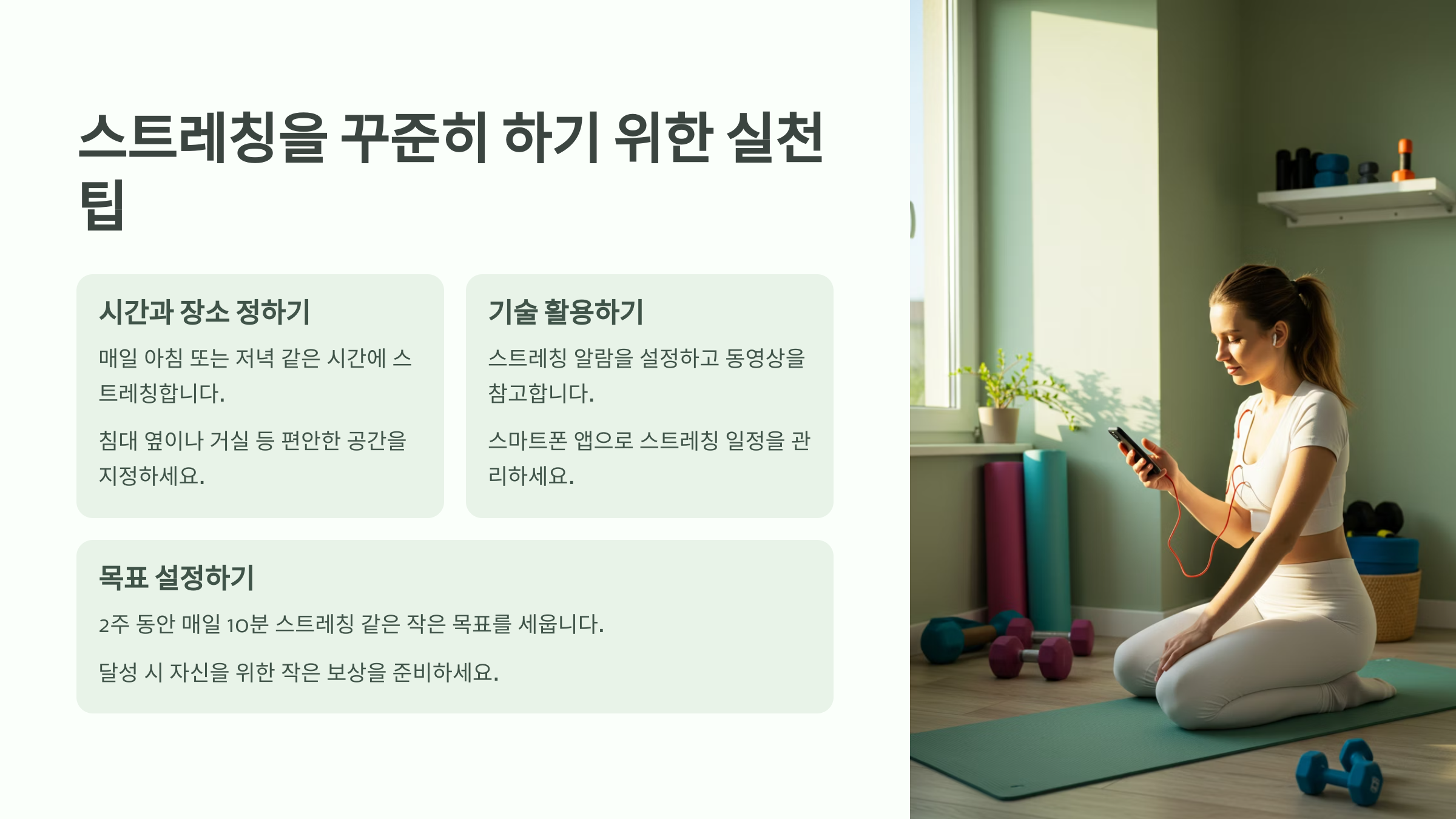 - 스트레칭을 꾸준히 하기 위한 실천 팁