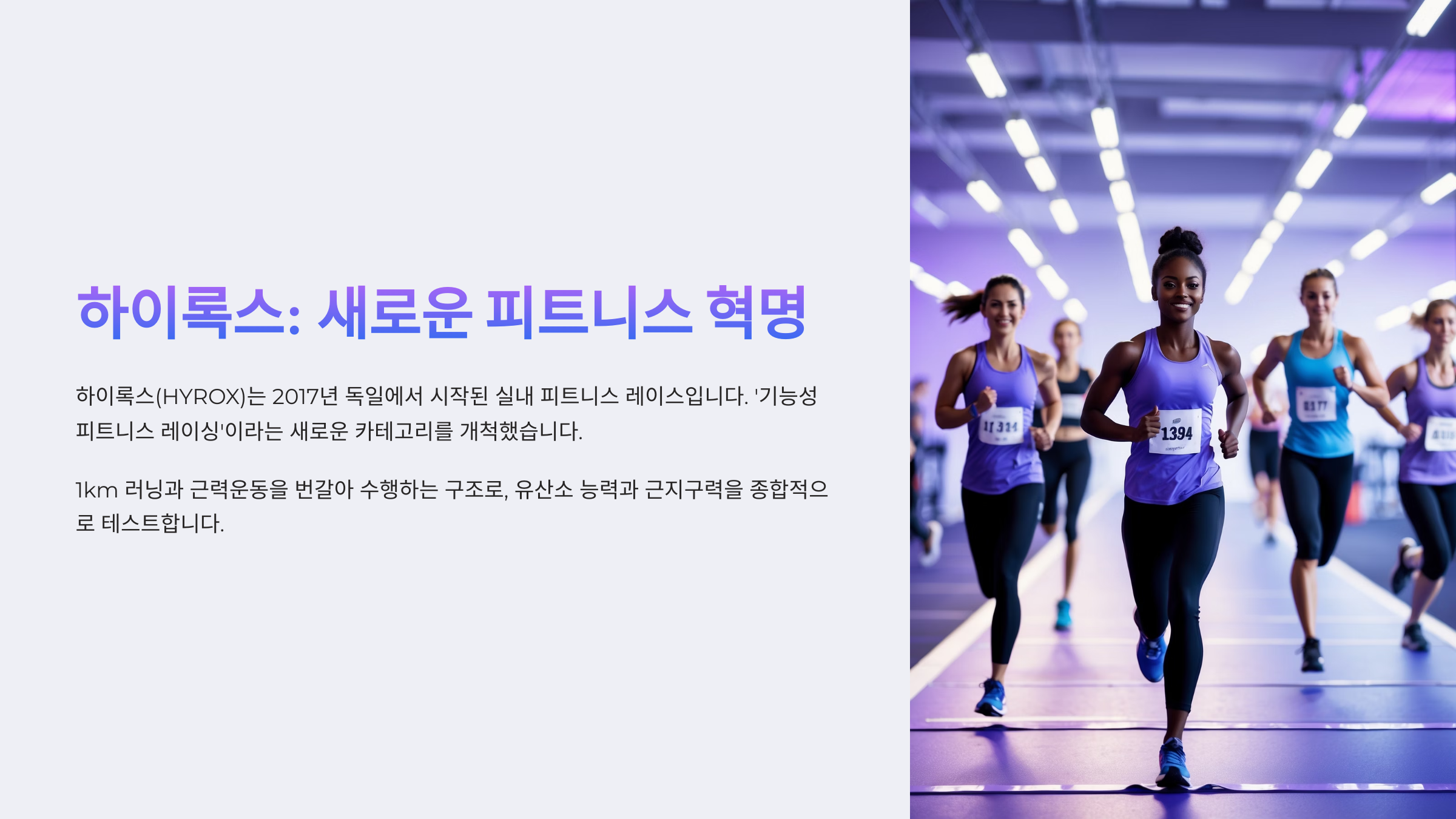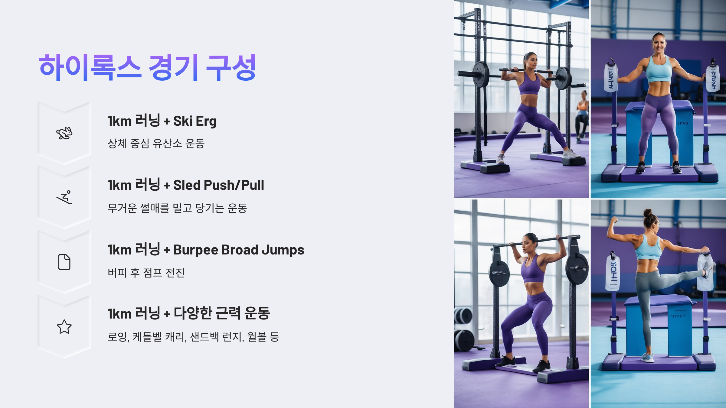 하이록스는 단순한 달리기 대회가 아닙니다. 1km 러닝과 근력운동을 번갈아 수행하면서 총 8km를 달리는 구조로, 참가자의 유산소 능력뿐만 아니라 근지구력, 멘탈, 전략적인 체력 분배 능력까지 종합적으로 테스트합니다. 이 덕분에 전통적인 마라톤이나 크로스핏 대회보다 훨씬 다이내믹하고 실용적인 피트니스 종목으로 주목받고 있죠. 🏃♂️🏋️