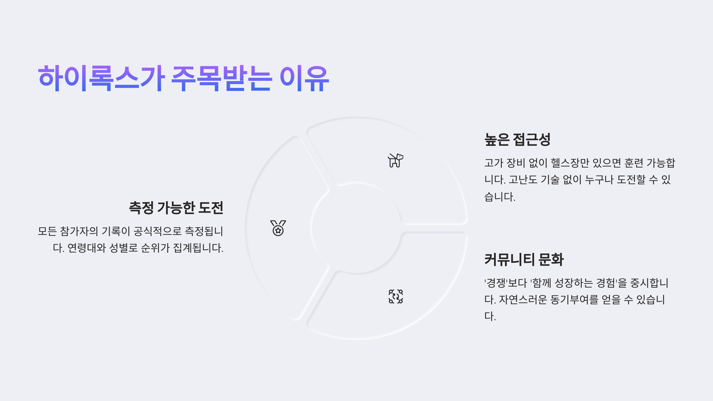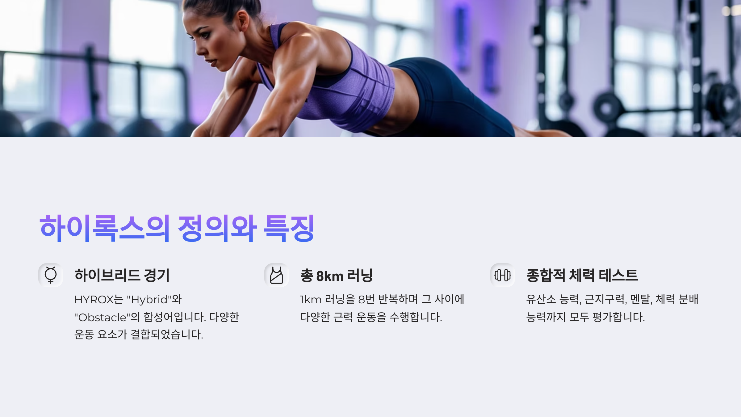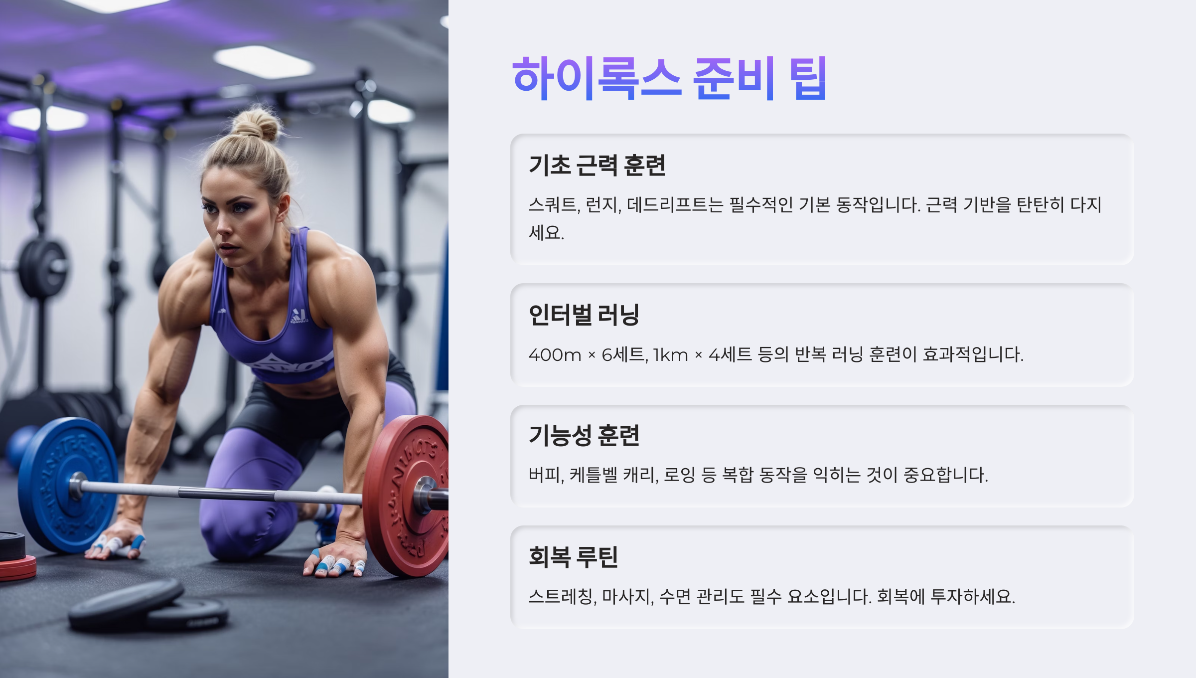 두 번째는 ‘접근성’입니다. 고가의 장비 없이 헬스장만 있으면 기본적인 훈련이 가능하며, 크로스핏처럼 고난도의 기술 없이도 누구나 도전할 수 있어요. 실제로 운동 초보자도 하프 코스부터 천천히 적응하며 하이록스를 즐기고 있어요.