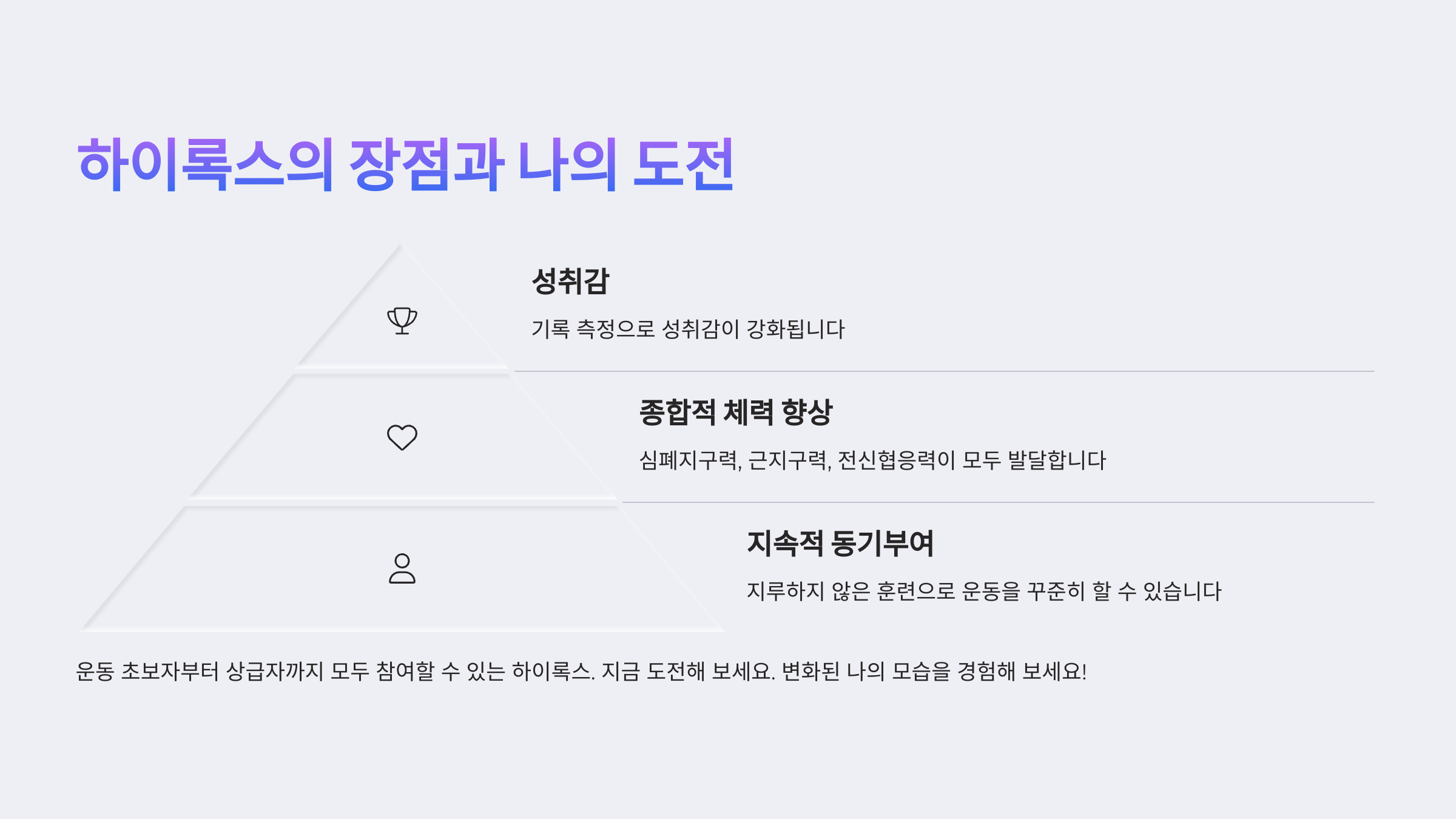 운동 초보자부터 상급자까지 모두가 함께 참여할 수 있는 하이록스. 지금 도전해 보세요. 그리고 그 변화된 나의 모습을 꼭 경험해 보시길 바랄게요! 😊