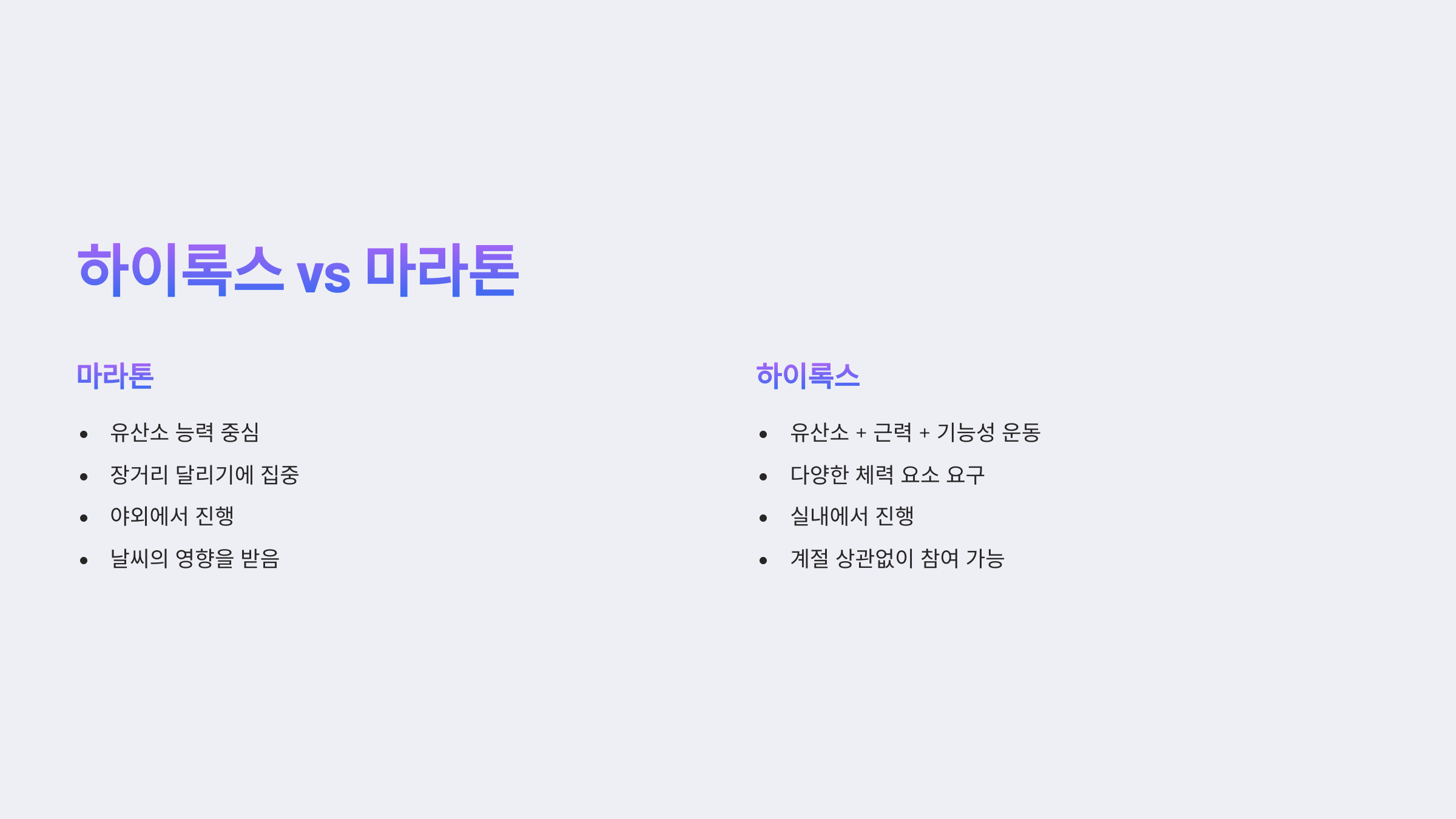 마라톤은 유산소 능력에 초점을 맞춘 장거리 달리기입니다. 하지만 하이록스는 유산소 + 근력 + 기능성 운동이 결합된 하이브리드형 경기로, 훨씬 다양한 체력 요소가 요구됩니다. 예를 들어, 마라톤을 잘 달리는 사람도 썰매 밀기나 버피, 샌드백 런지에서 체력이 급격히 떨어질 수 있어요.