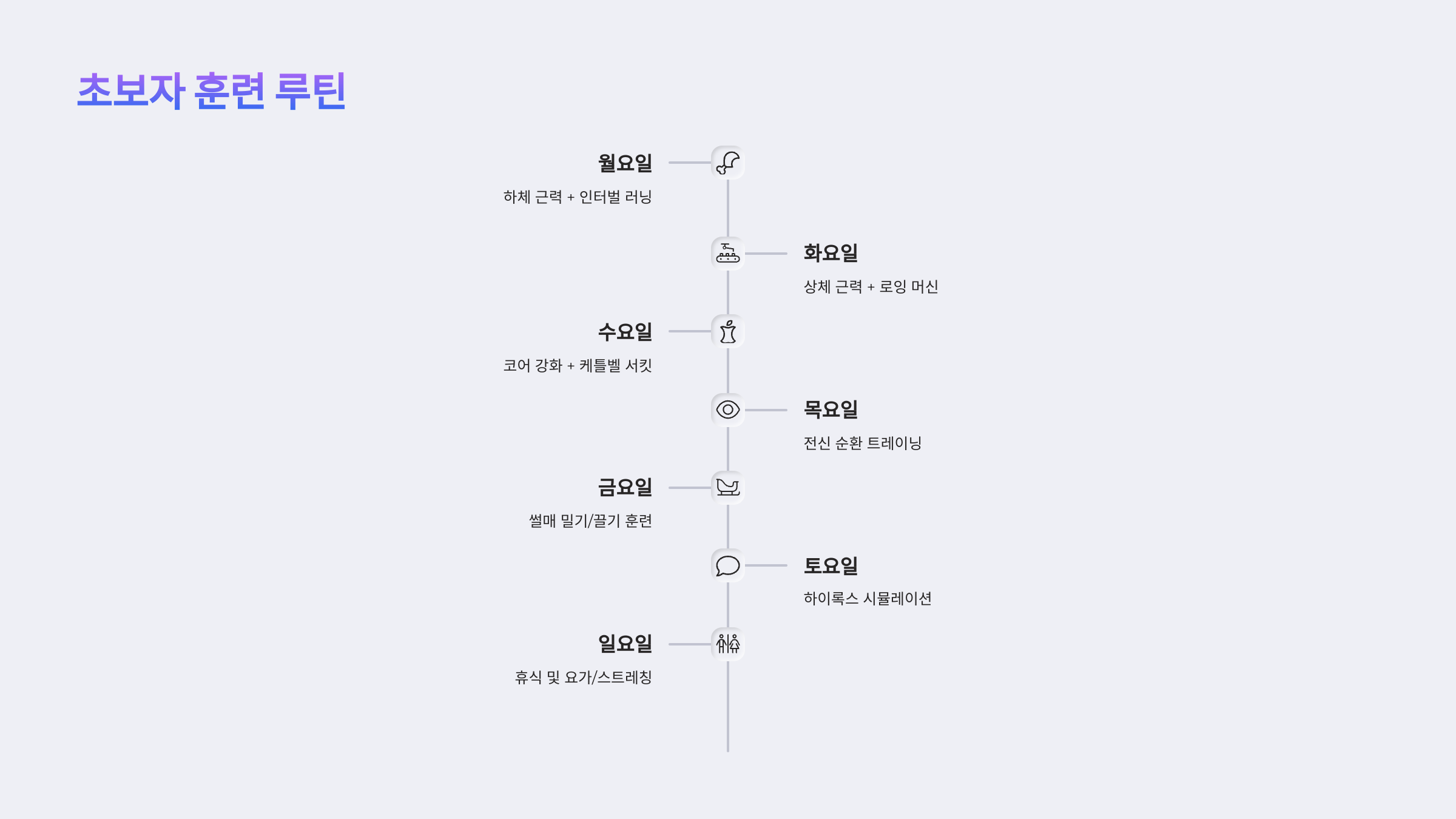 - 기능성 훈련: 버피, 케틀벨 캐리, 로잉 등 복합 동작 익히기