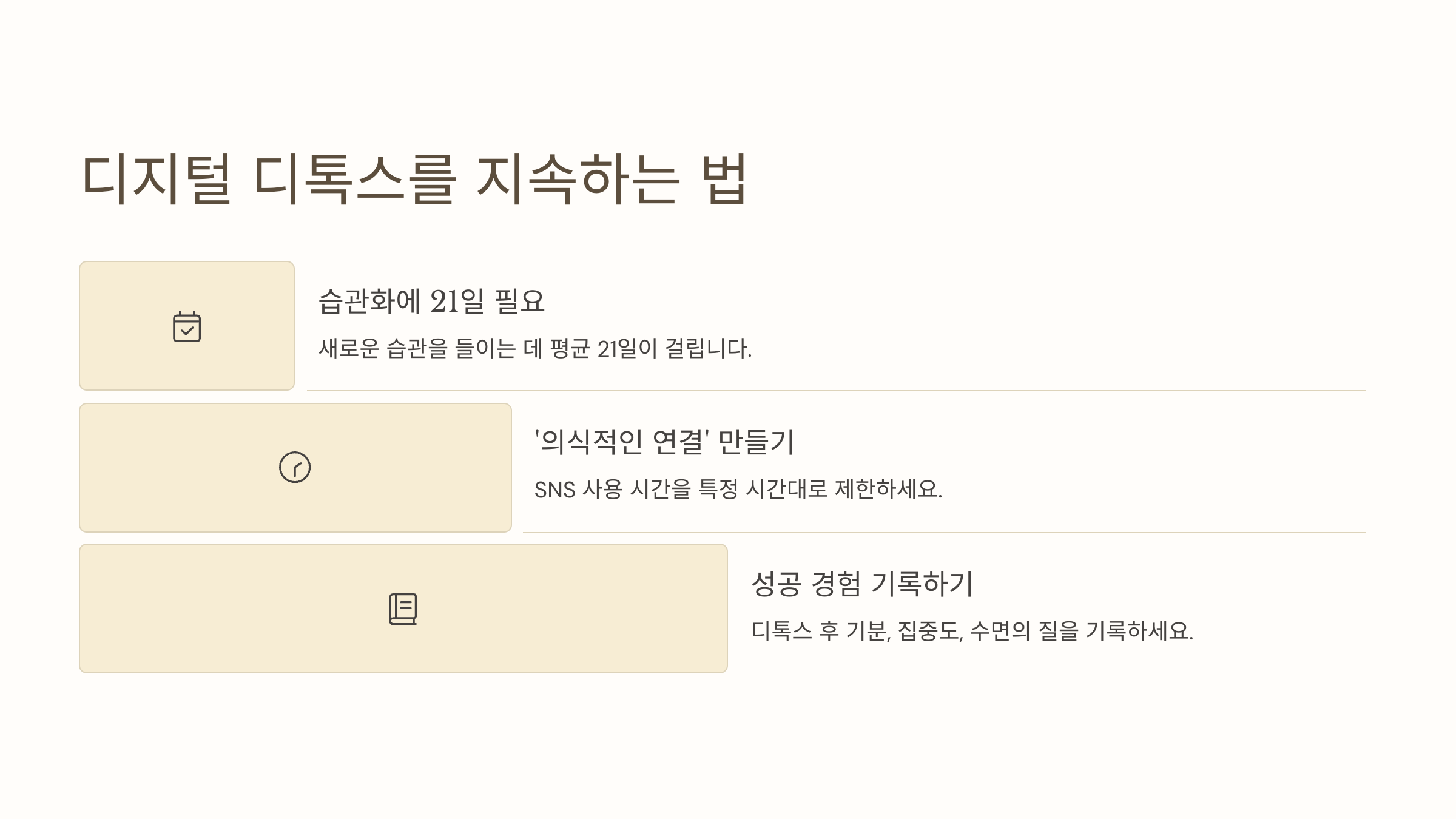 무작정 연락을 끊는 것이 아니라, SNS 사용 시간은 오전 10시~10시 30분으로 제한하는 식의 계획이 효과적입니다. - 성공 경험 기록하기