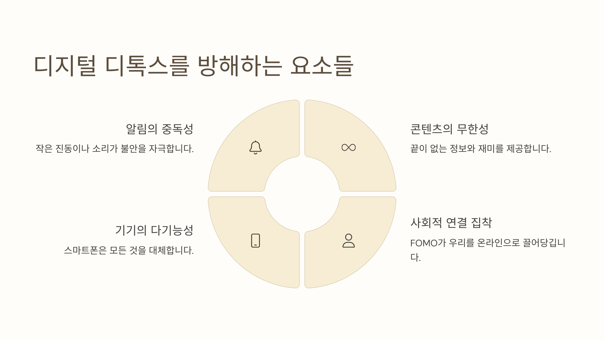 이 모든 요소가 복합적으로 작용하며 디지털 중독을 더욱 강화시키는 것이 현실입니다.