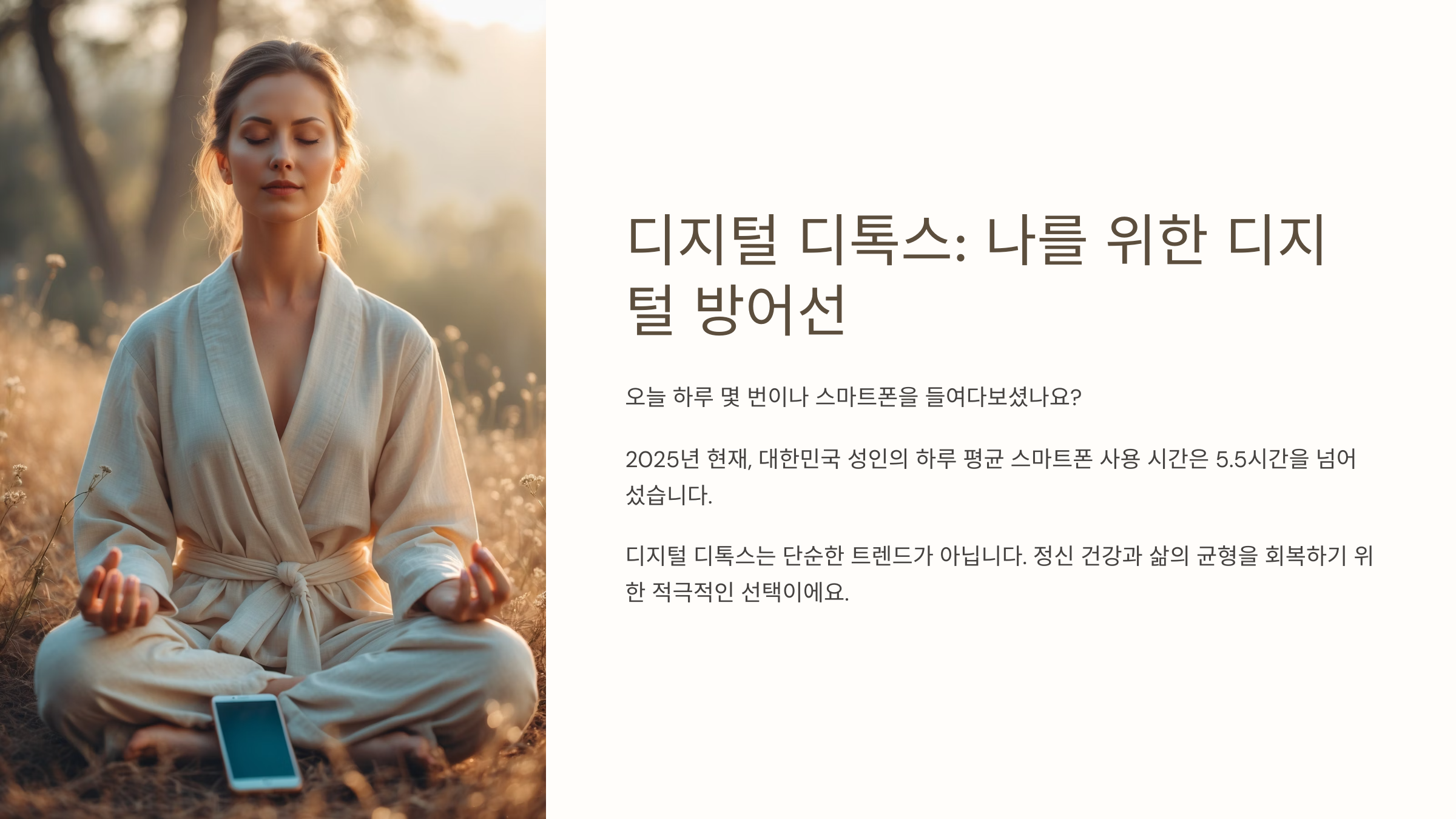 중요한 건 ‘끊는 것’이 아니라, ‘선택하는 것’입니다. 더 이상 스마트폰이 나를 통제하게 두지 않고, 내가 내 삶을 선택하는 주체가 되는 것. 그것이 디지털 디톡스의 진짜 목표입니다 🌿