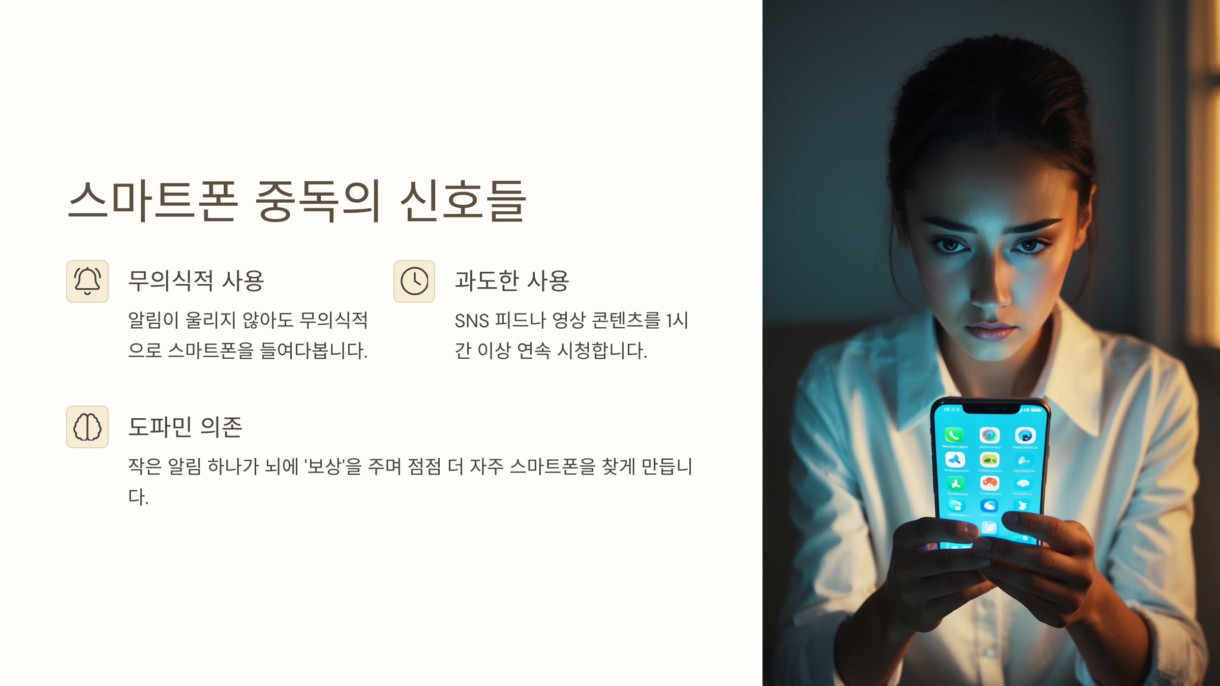 - 알림의 중독성: 작은 진동이나 소리 하나가 ‘내게 뭔가 중요한 일이 생긴 건 아닐까?’ 하는 불안을 자극합니다.