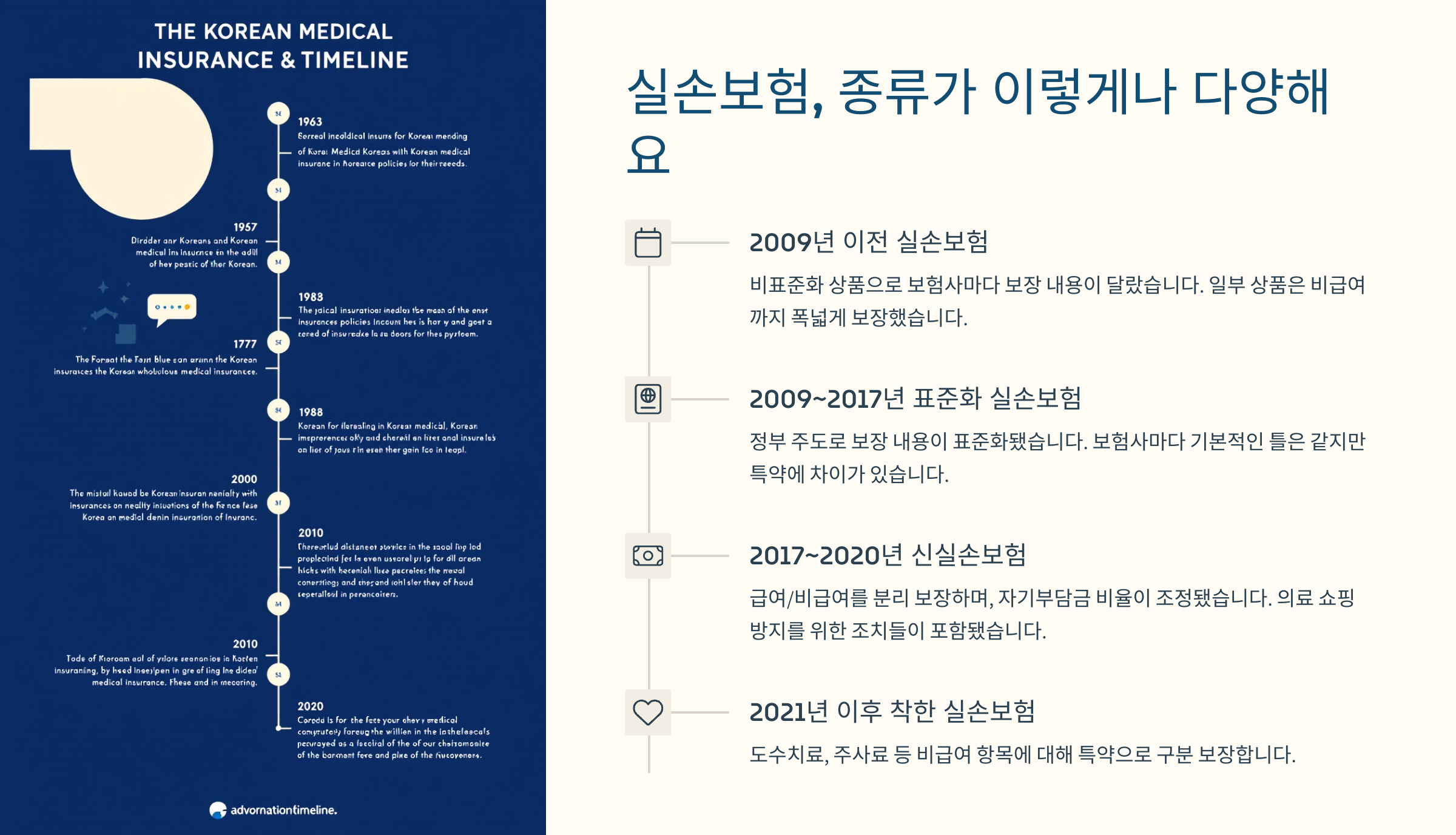 실손보험은 보장 내용과 조건에 따라 다양한 유형이 존재합니다. 특히 2009년, 2017년, 2021년을 기준으로 크게 나뉩니다.