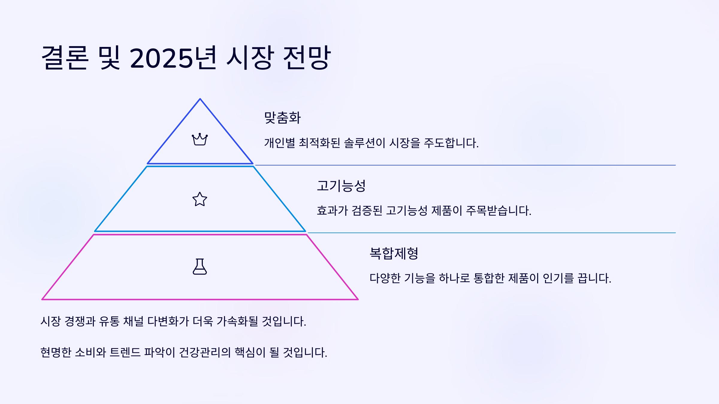 이처럼 2025년 건강기능식품 트렌드는 빠르게 변화하고 있으며, 소비자들은 더욱 똑똑하고 신중하게 제품을 선택하고 있습니다. 올바른 정보를 바탕으로 나에게 맞는 제품을 선택해 건강한 삶을 이어가시길 바랍니다.