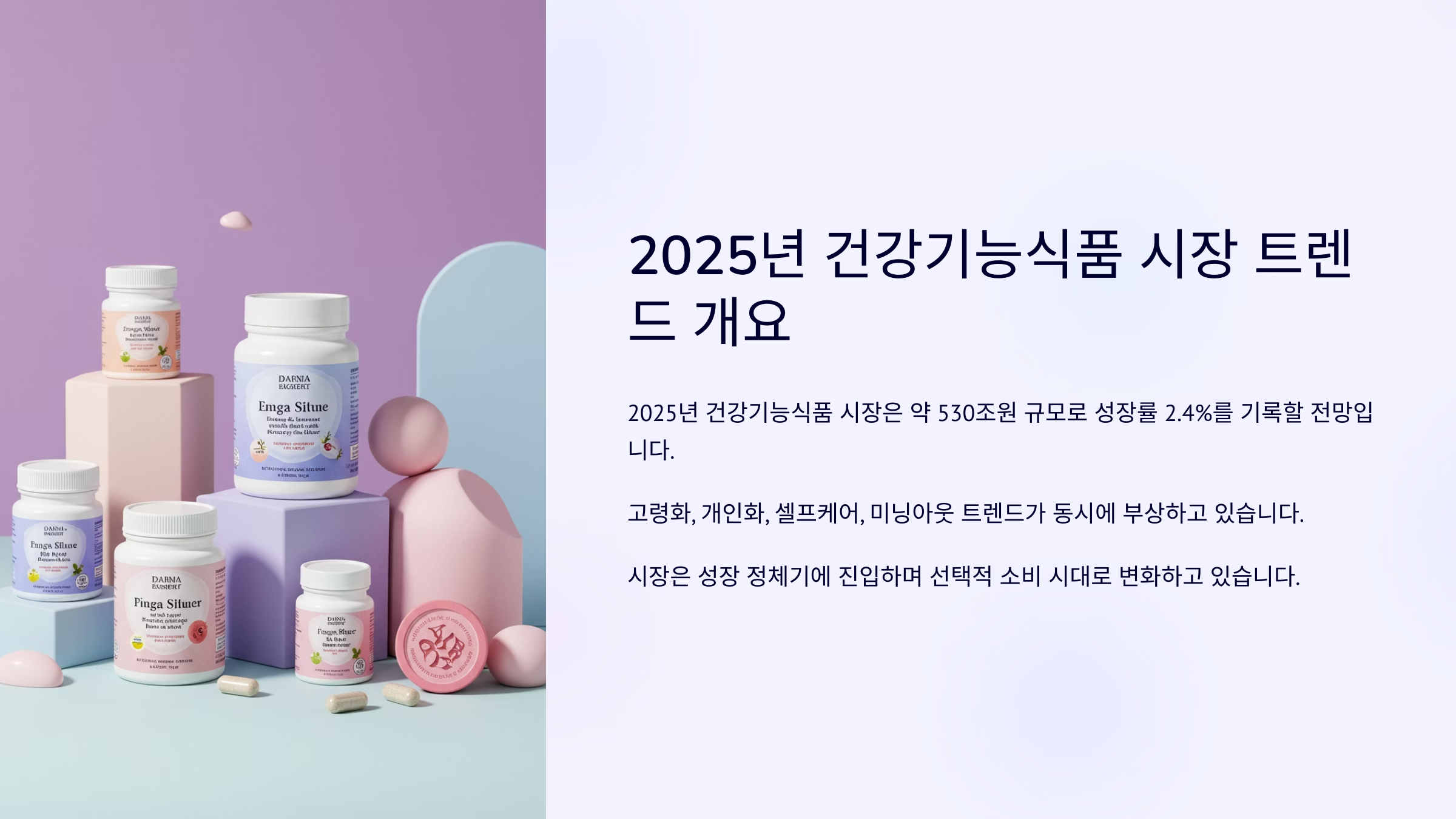 2025년 건강기능식품 시장은 눈에 띄게 진화하고 있습니다. 코로나19 팬데믹을 거치며 높아진 건강에 대한 관심은 이제 개인 맞춤형, 기능성 강화, 지속 가능성까지 고려하는 방향으로 확장되고 있습니다. 특히 Z세대와 밀레니얼 세대의 소비자들이 건강기능식품 시장의 주요 소비층으로 떠오르면서, 보다 스마트하고 체계적인 소비 트렌드가 자리 잡고 있습니다.