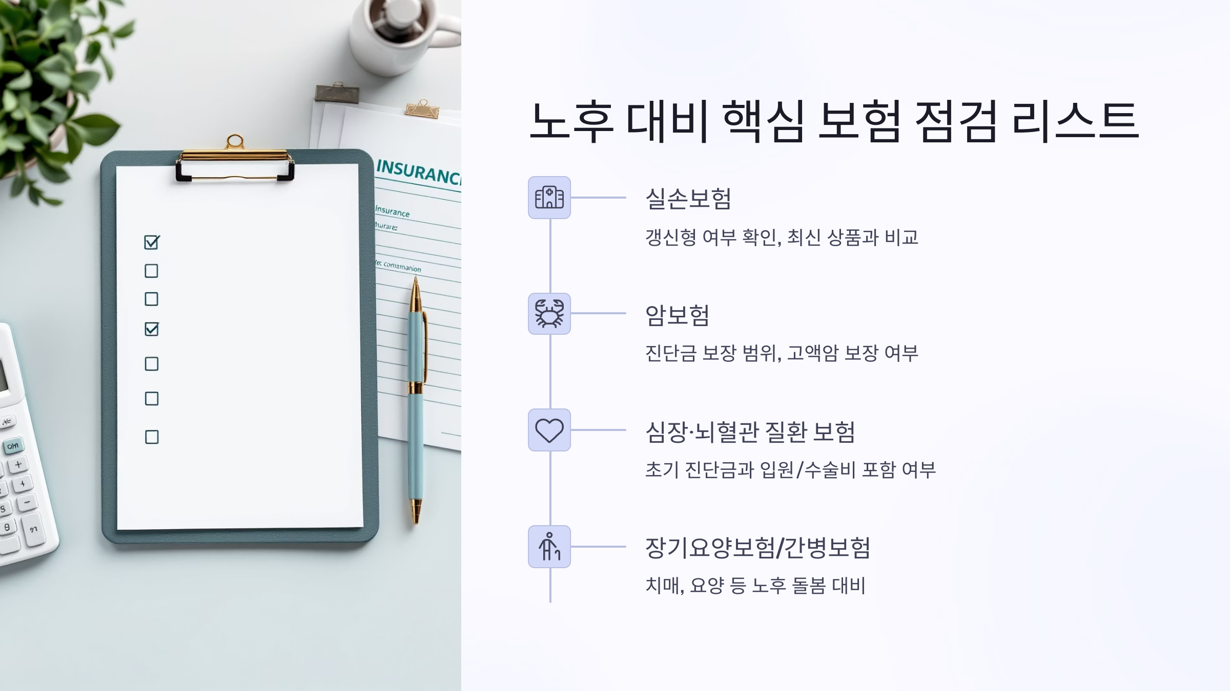 특히 50대 이후에는 건강 상태에 따라 보험 가입이 어려워지는 경우가 많고, 실손보험, 암보험, 장기요양보험 등 노후에 꼭 필요한 보장에 미리 대비해두는 것이 현명합니다.