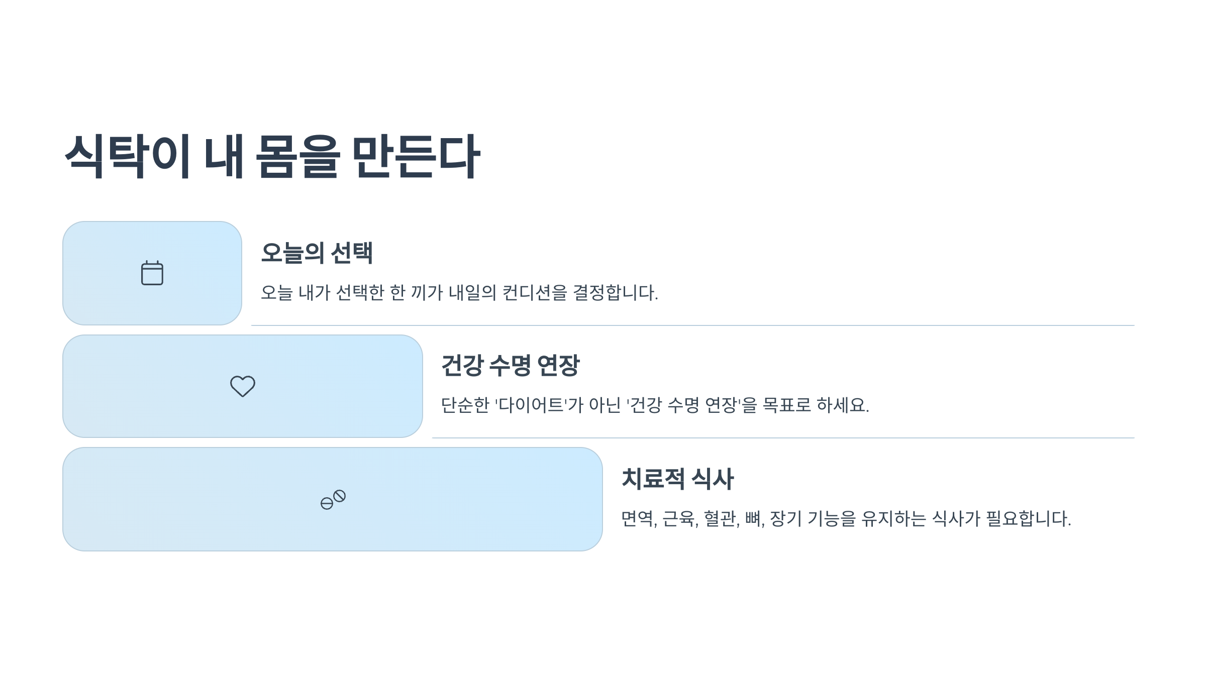 오늘 내가 선택한 한 끼가 내일의 컨디션을 결정하고, 5년 후의 건강을 만든다는 사실을 잊지 마세요. 지금부터 시작하면 결코 늦지 않았습니다.
