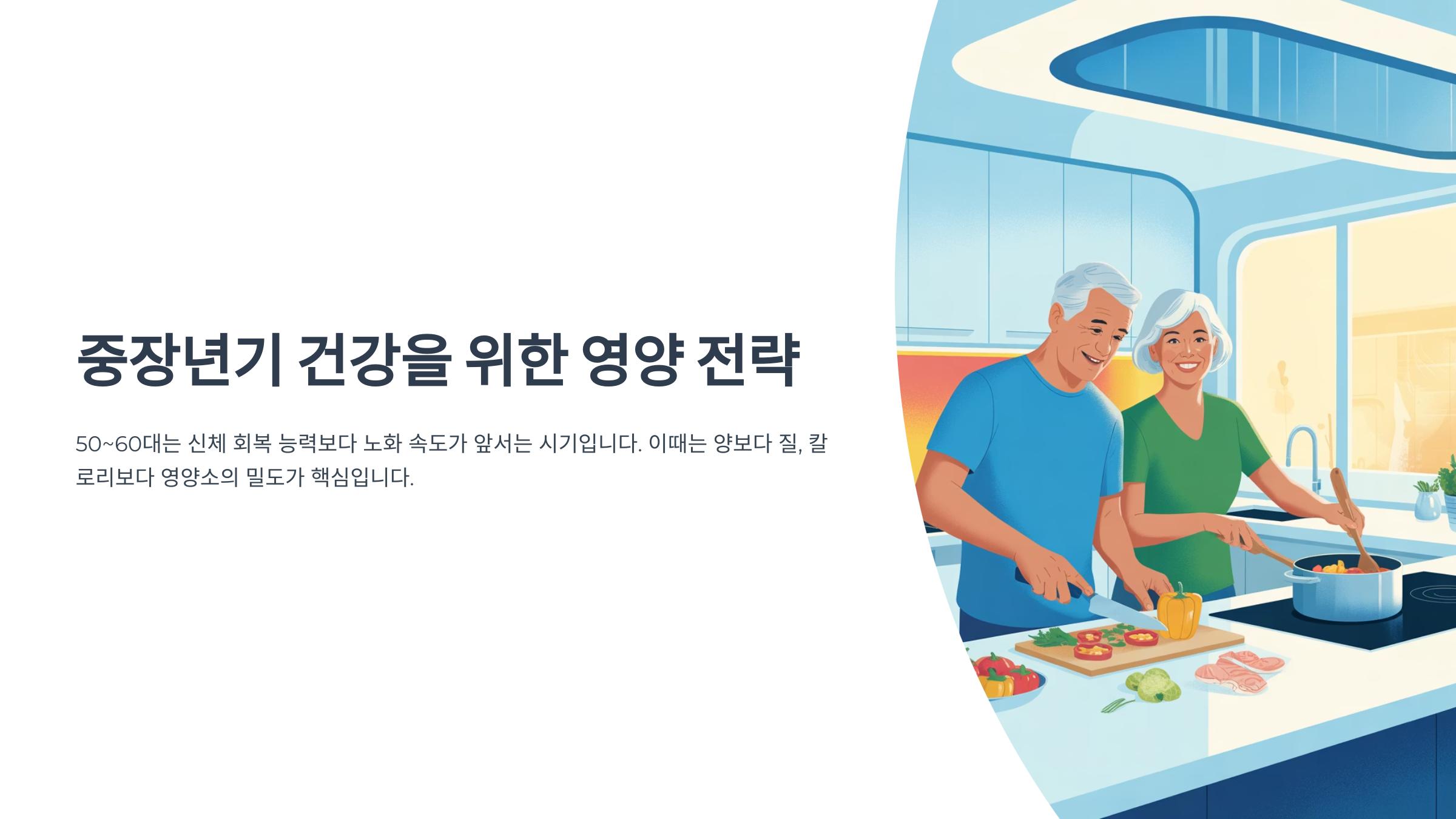 5060세대가 가장 먼저 고려해야 할 것은 젊을 때와는 달라진 신체 상태에 맞춘 영양 전략입니다.